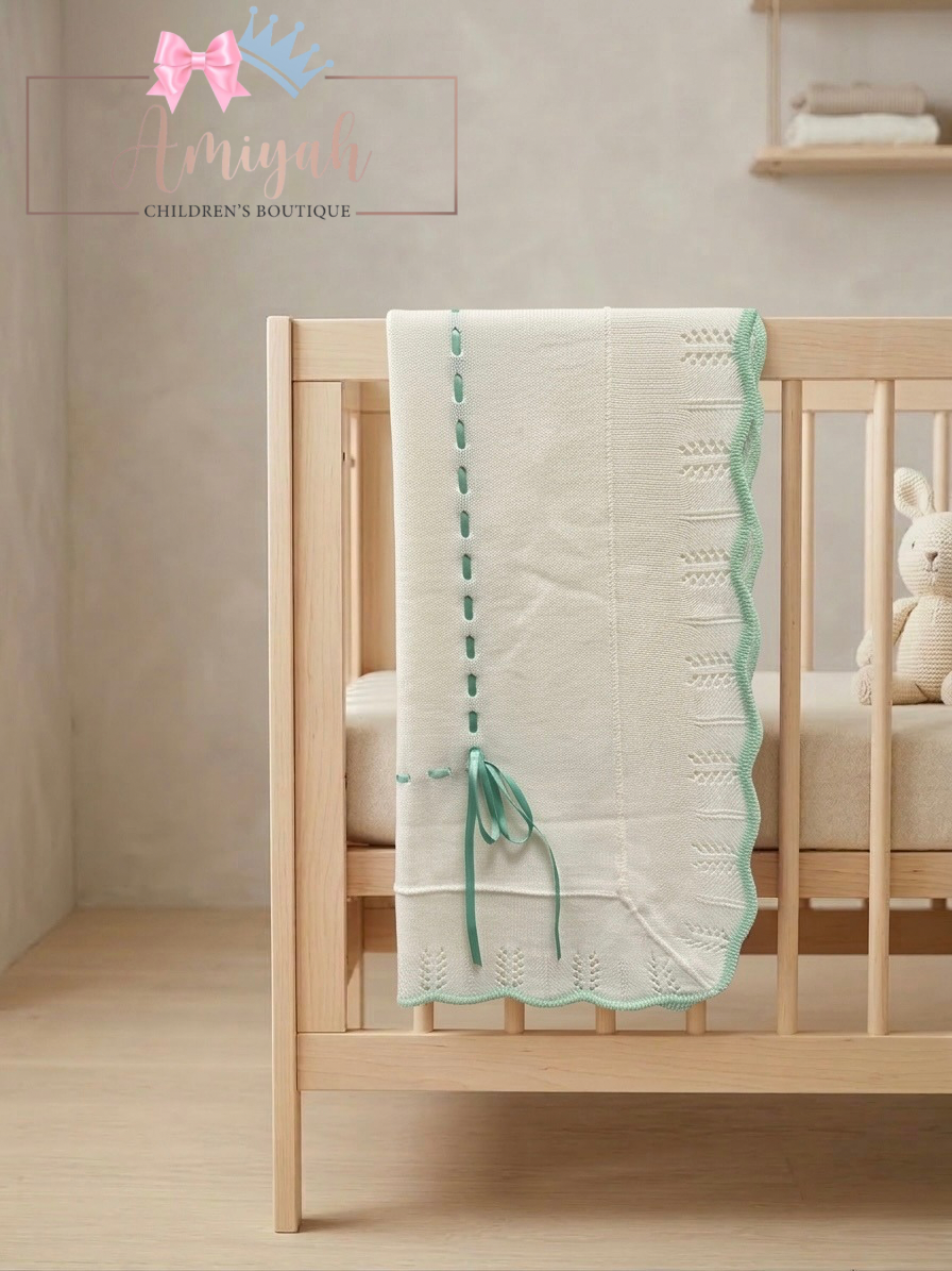 Ivory & Mint Trim Knitted Blanket