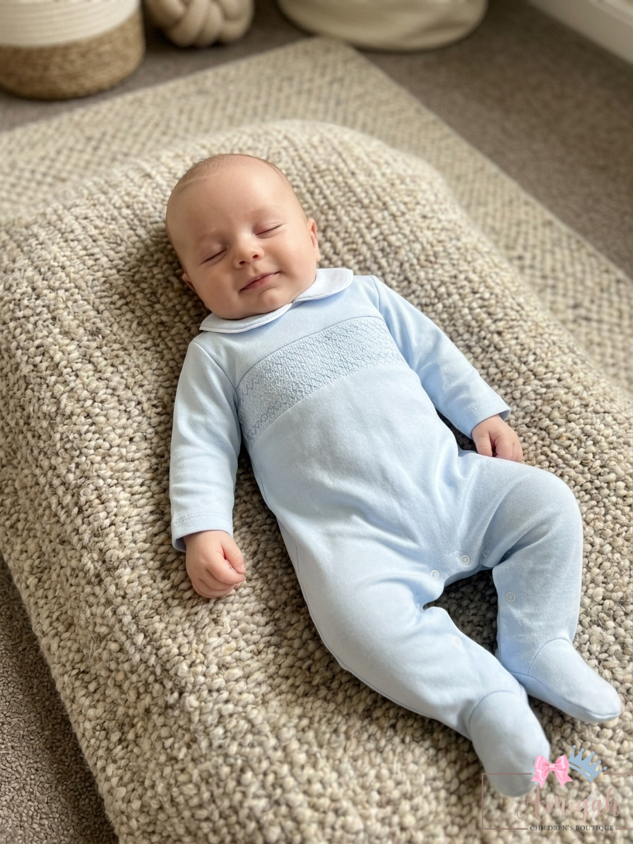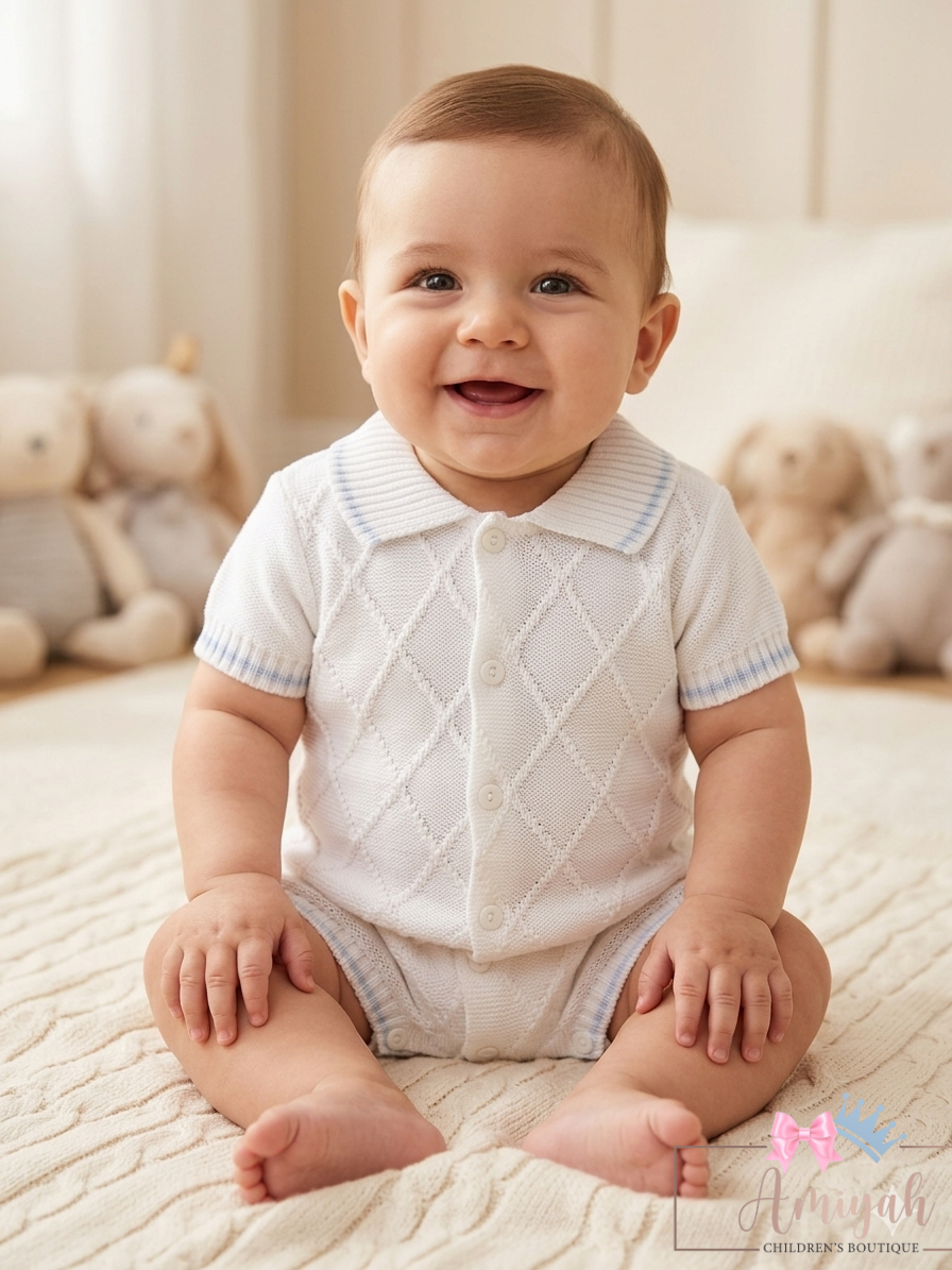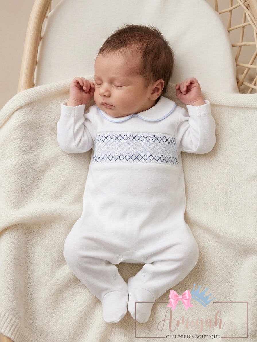 White Blue & Navy Smocked Babygrow