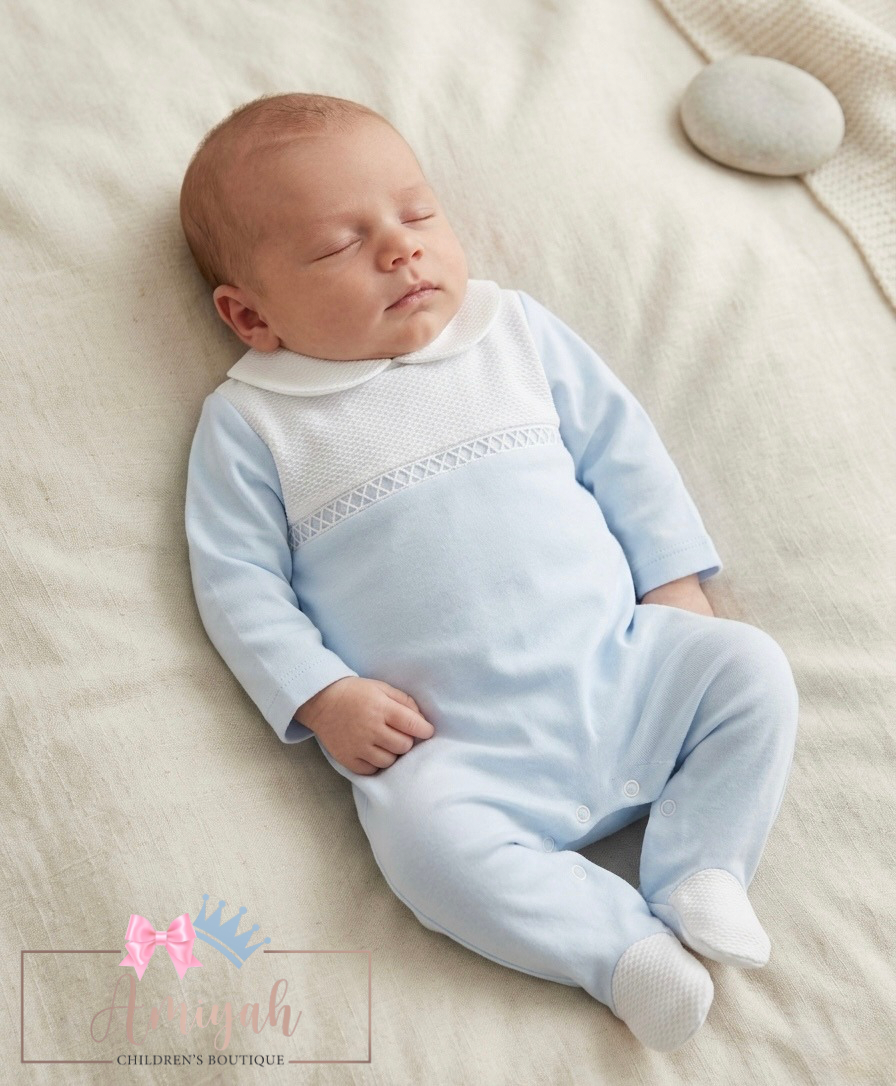 Blue & white smocked babygrow