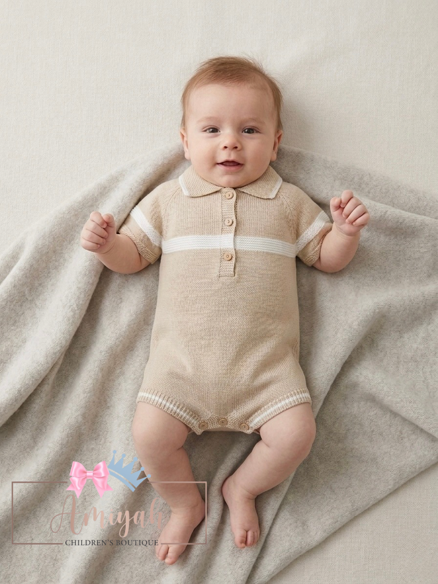 Beige Knitted Stripe Rompers