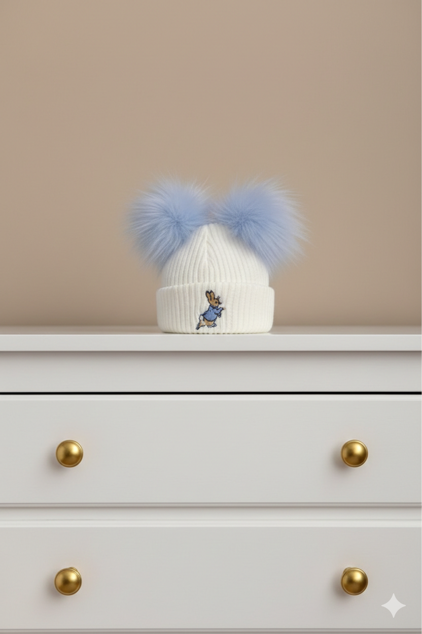 Ivory & Blue Rabbit Pom Pom Hat