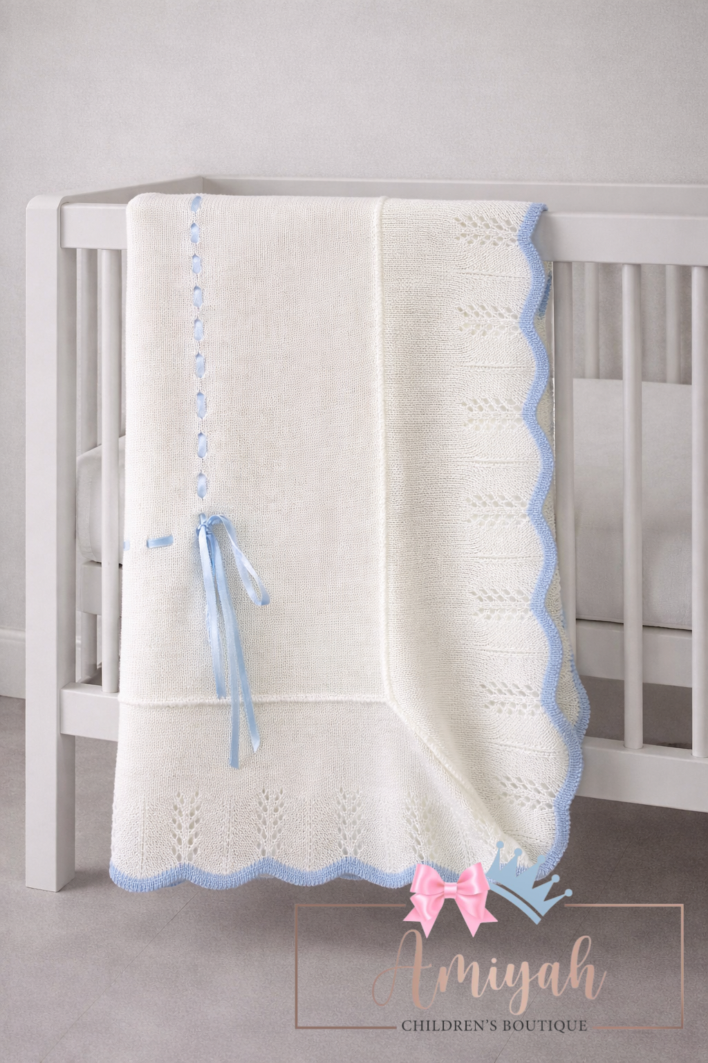 Ivory & Blue Trim Knitted Blanket