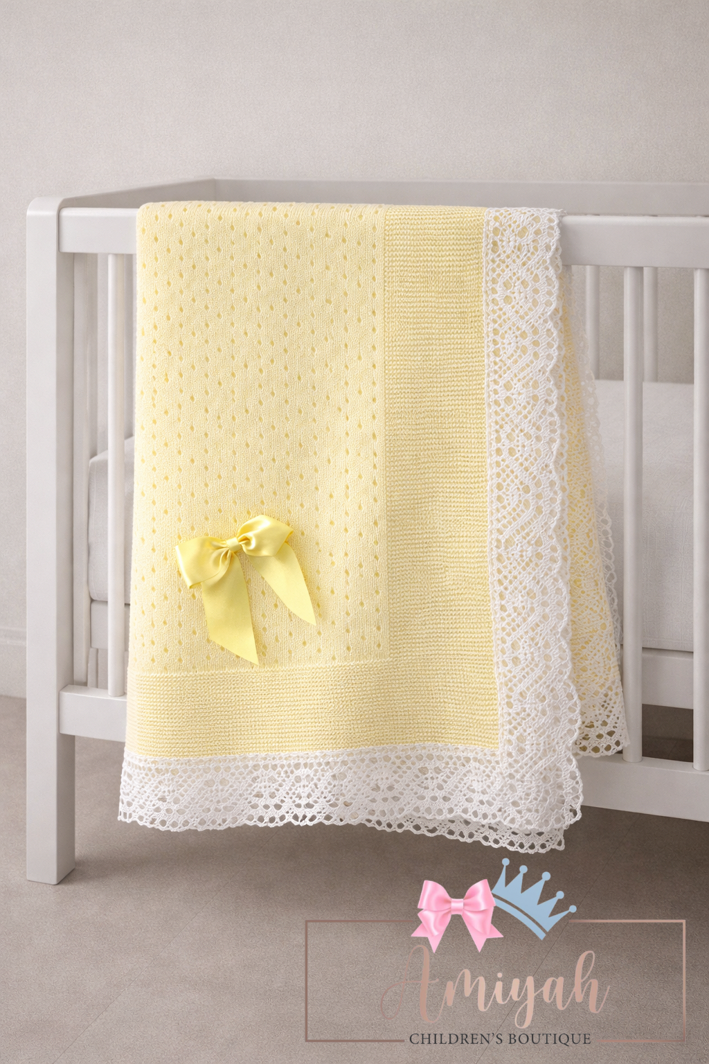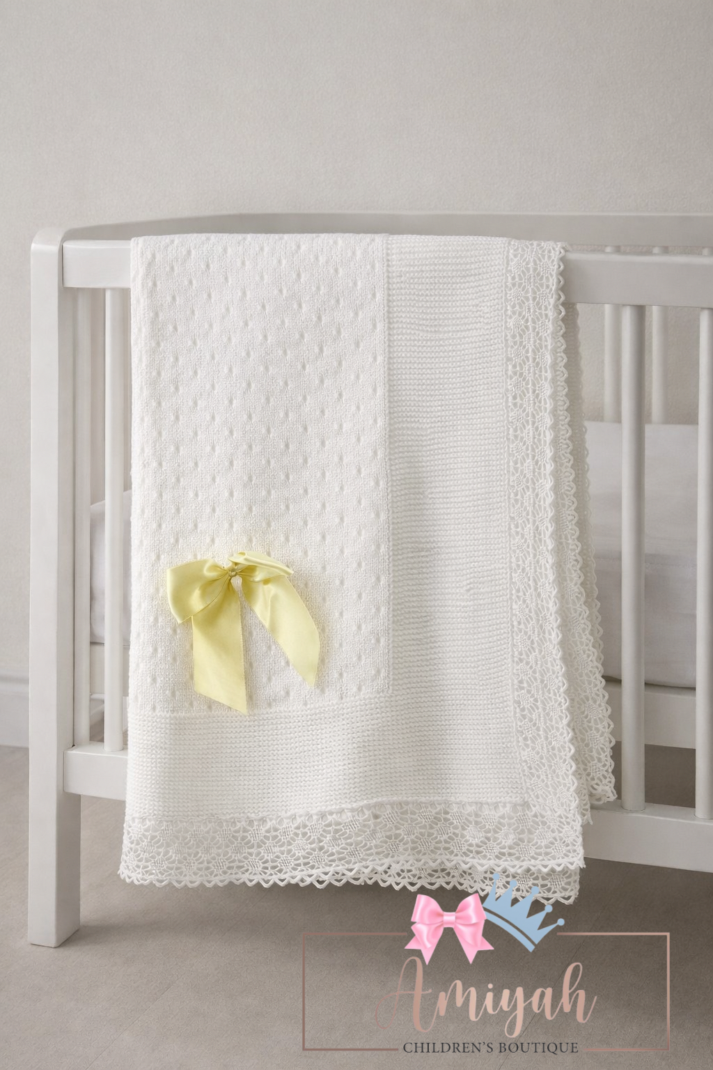 White & Lemon Lace Trim Knitted Blanket