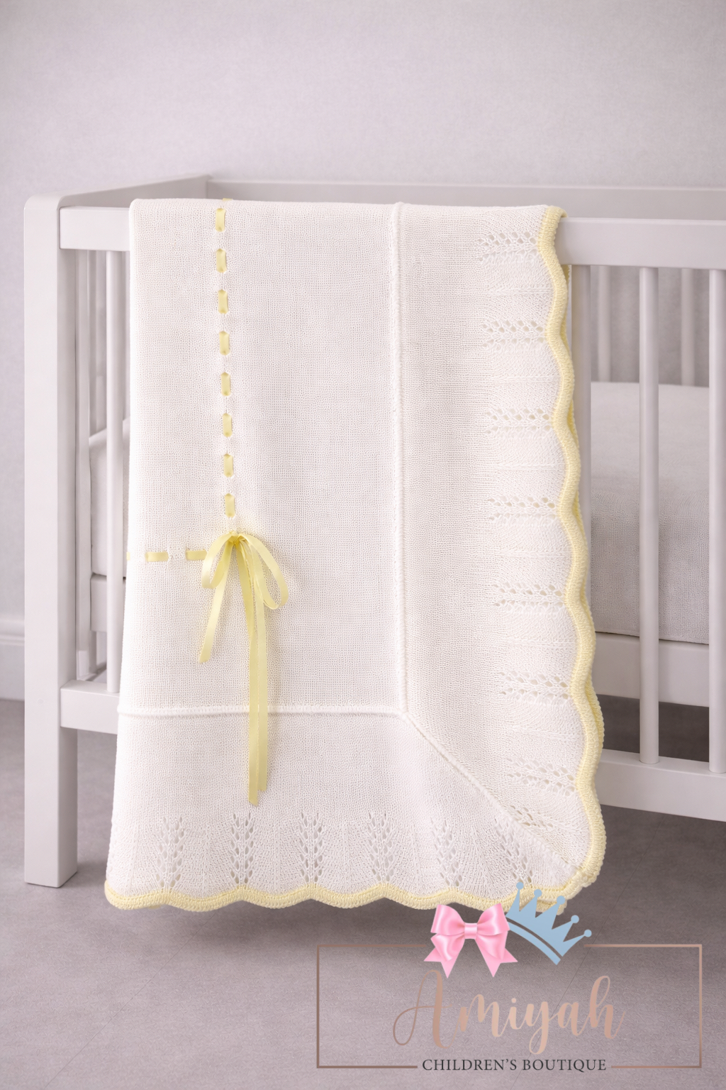 Ivory & Lemon Trim Knitted Blanket