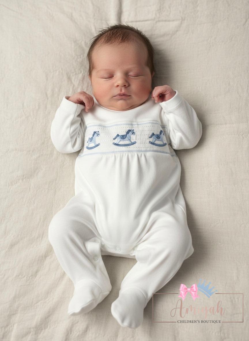White Smocked Rocking Horse Babygrow