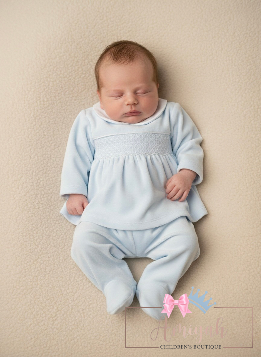 Blue Velour Smocked 2 Piece Set