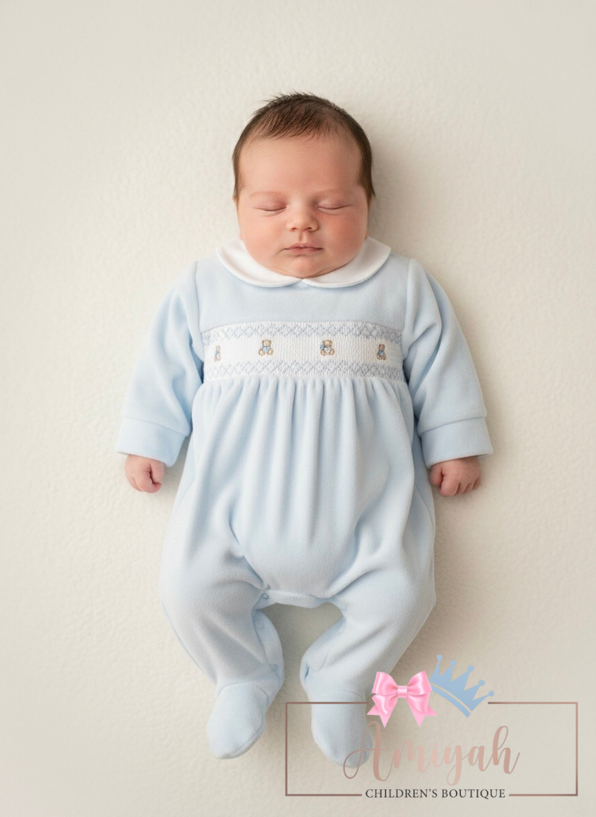 Blue Velour Smocked Teddy Babygrow