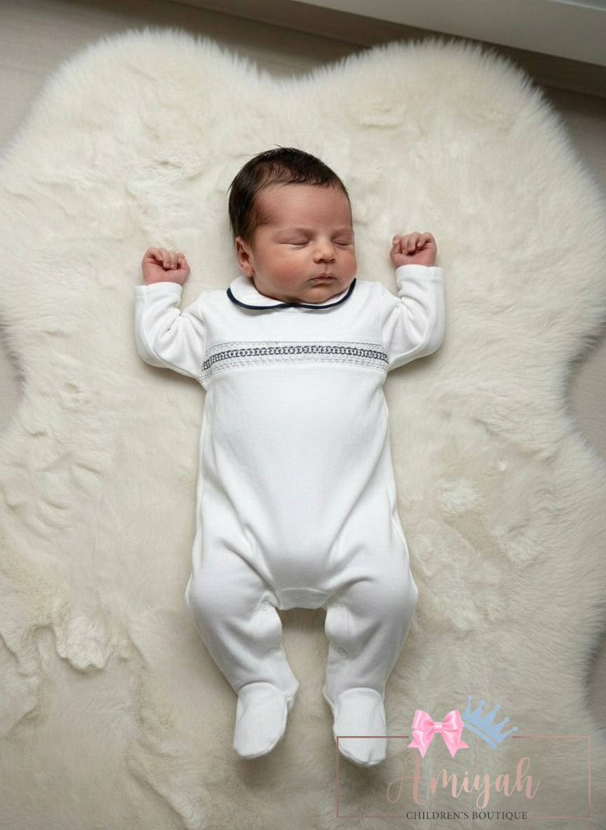 White & Navy Smocked Babygrow