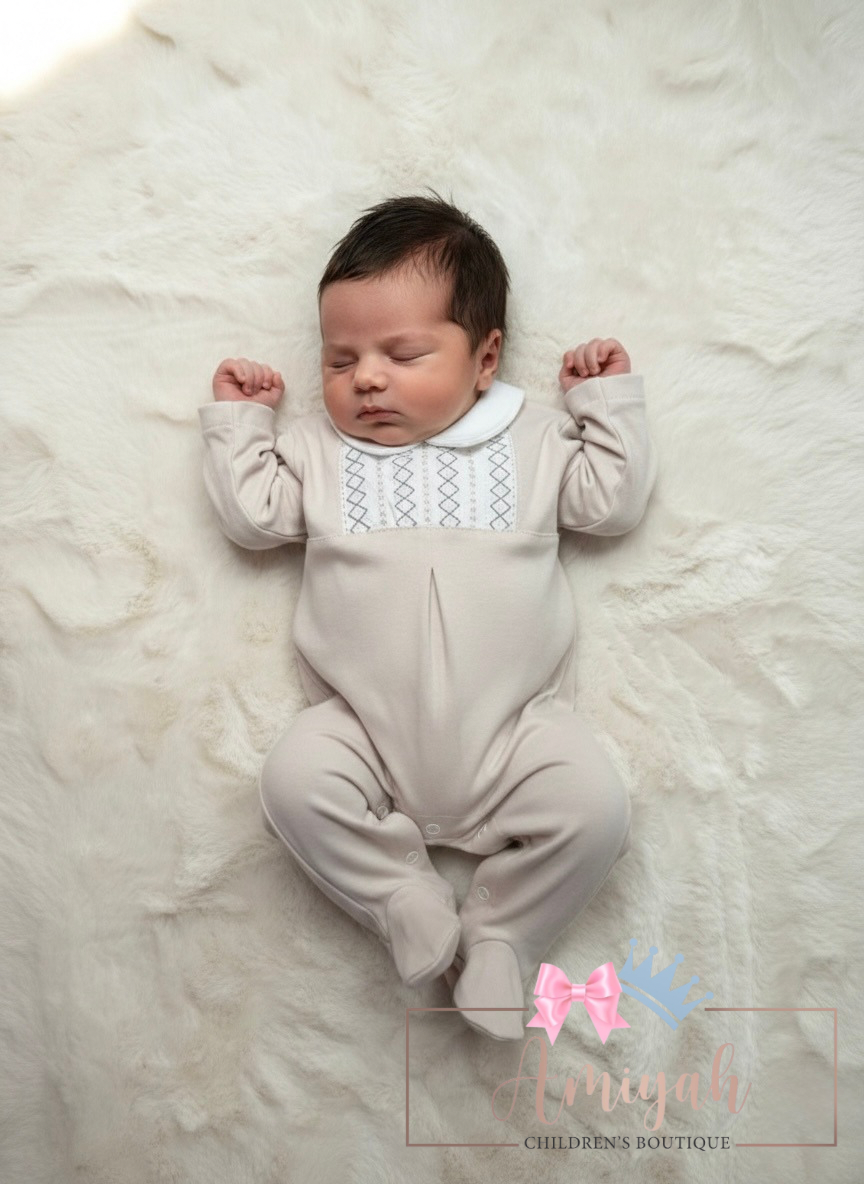 White & Beige Smocked Babygrow