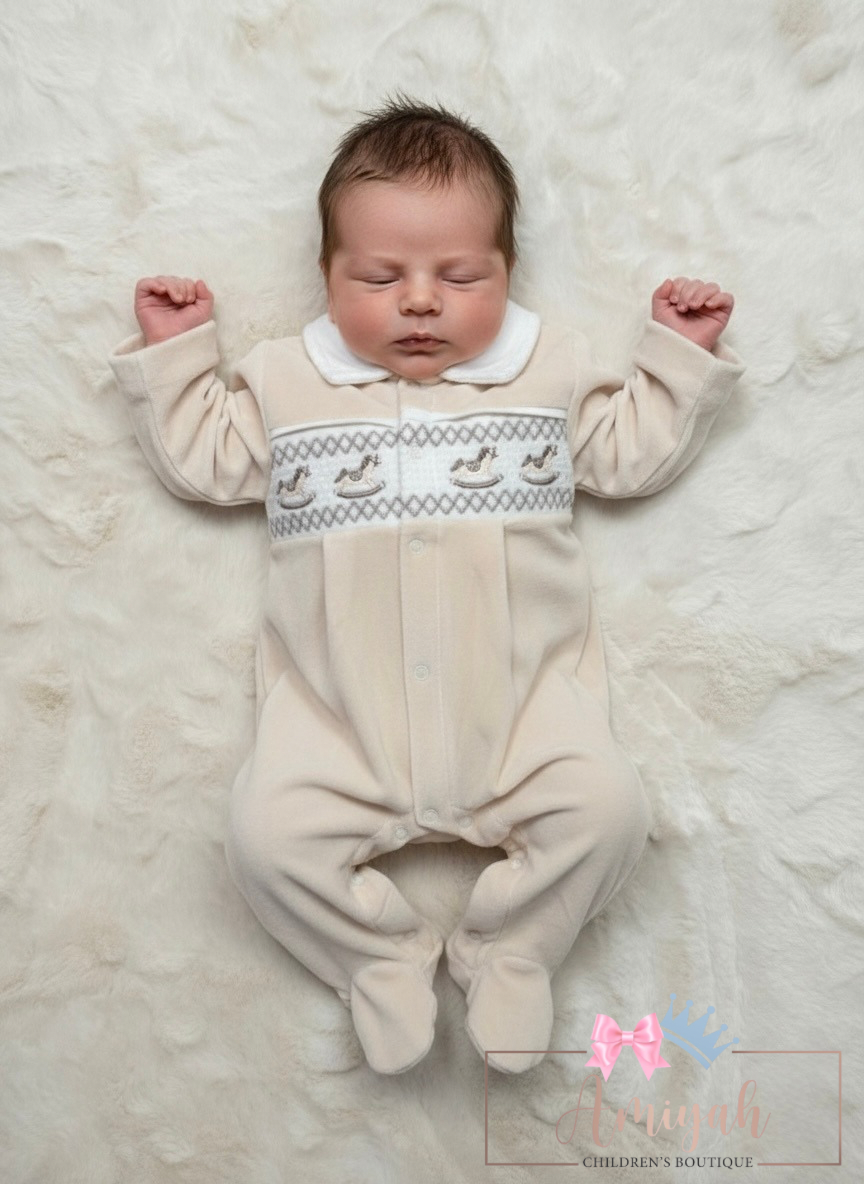 Beige Velour Smocked Rocking Horse Babygrow