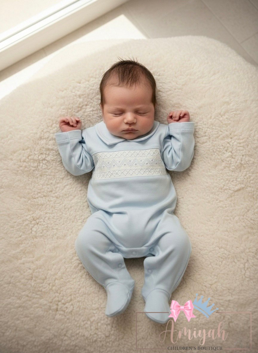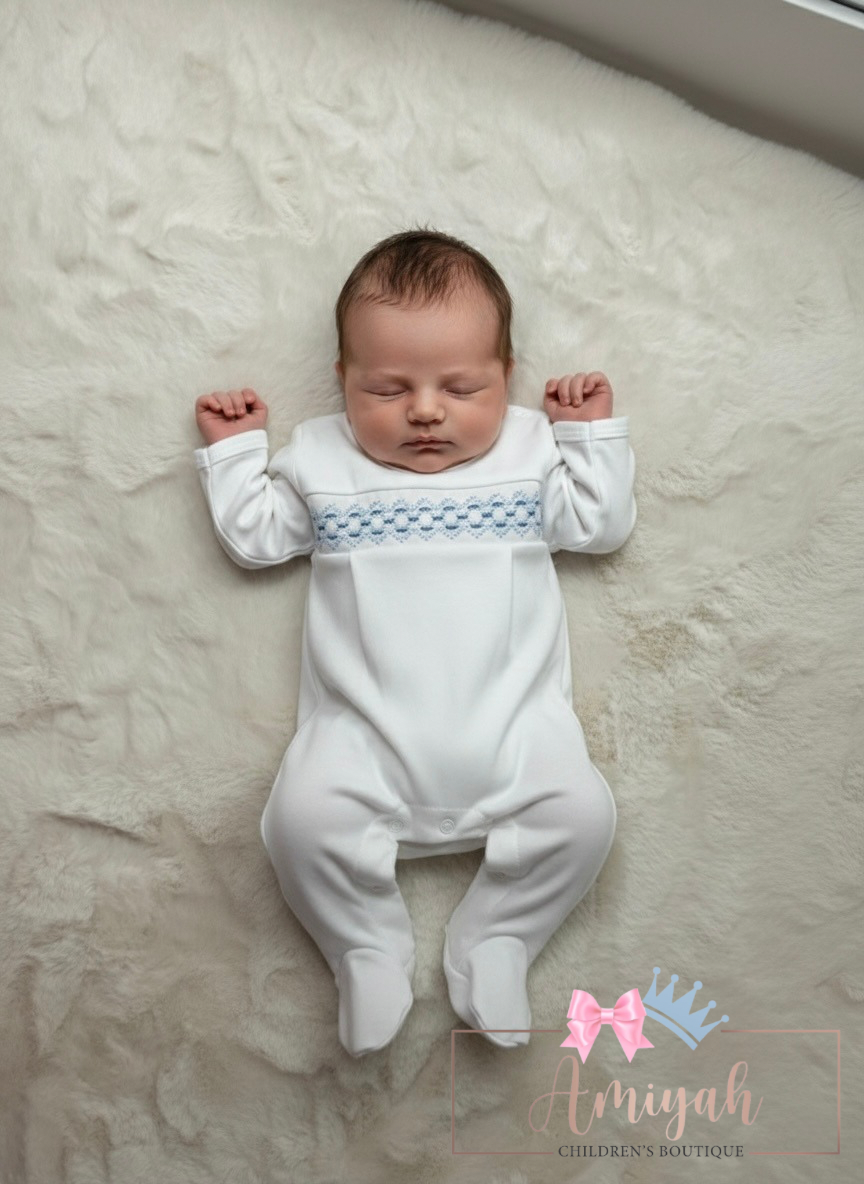 White & Blue Smocked Babygrow