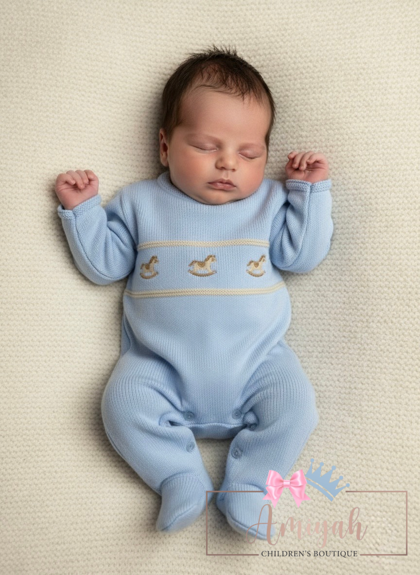 Blue Knitted Rocking Horse Babygrow