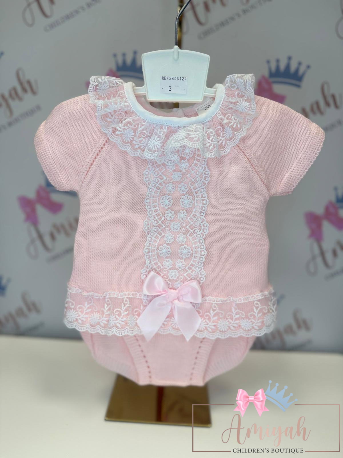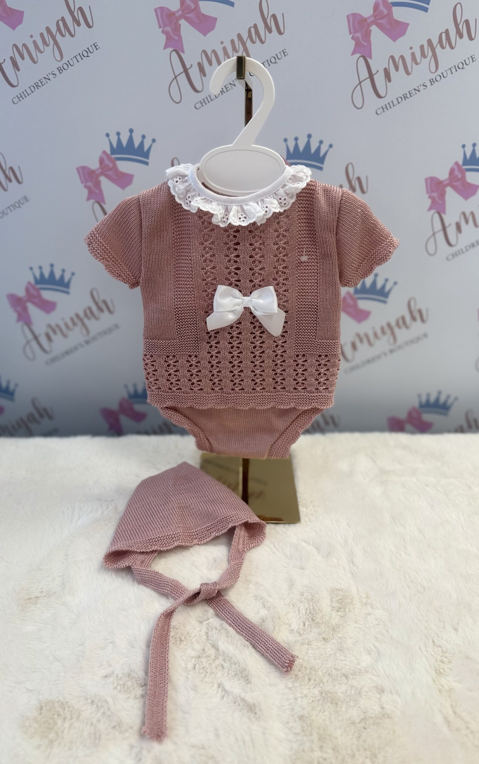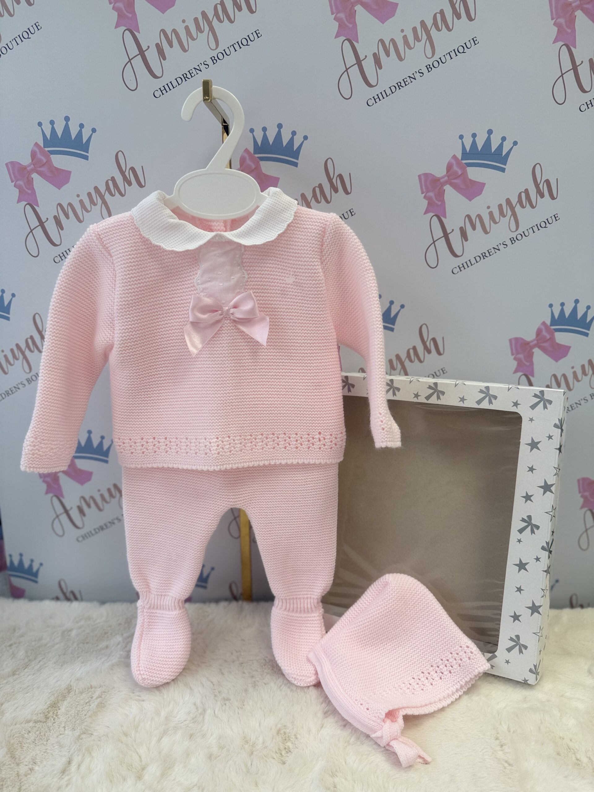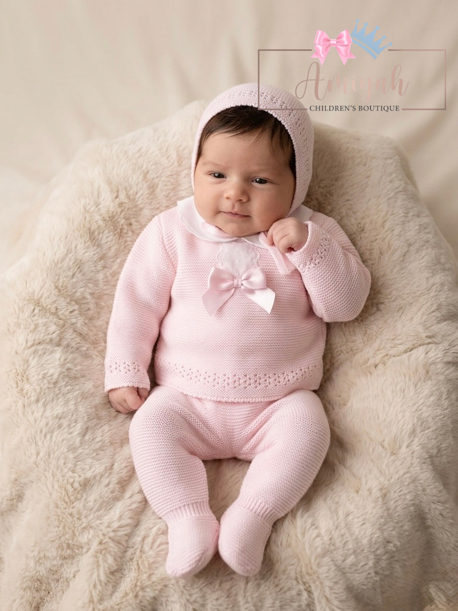 Knitted 3 Piece Box Set – Pink with Collar & Bow Detail