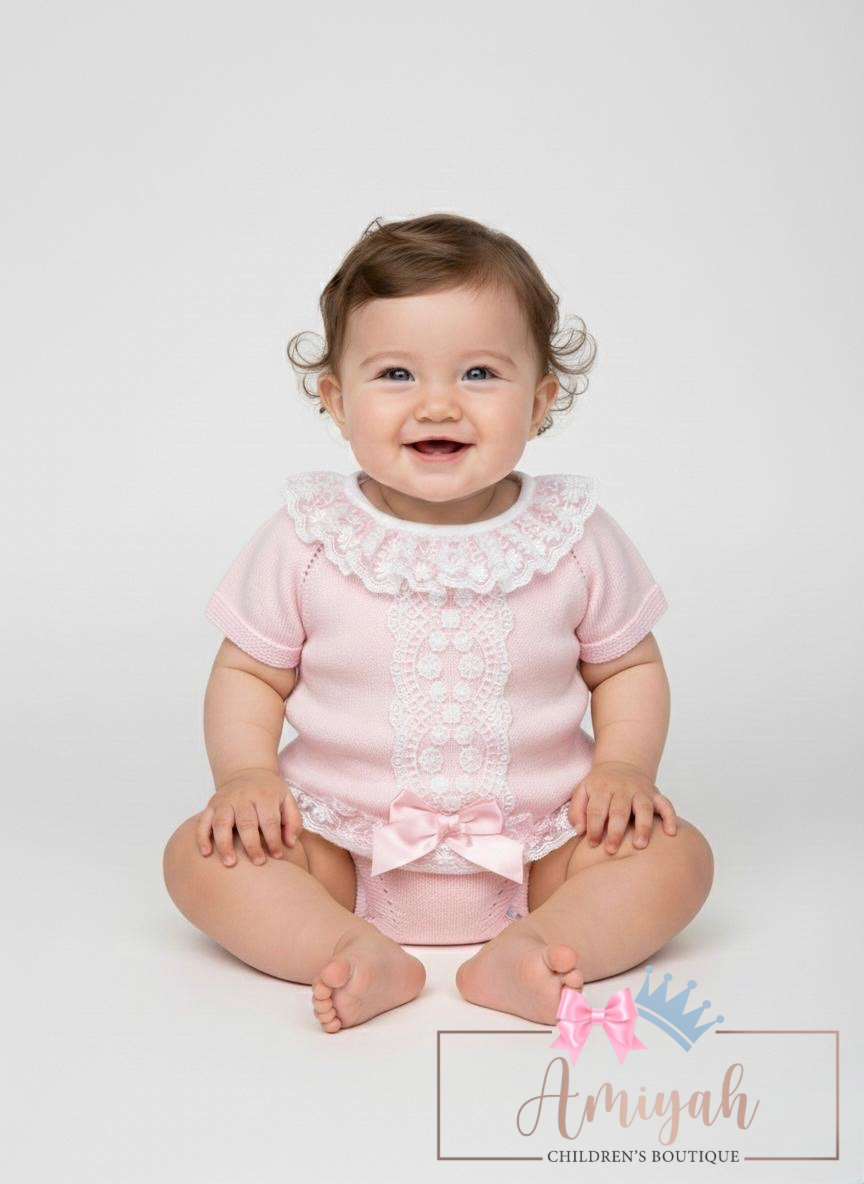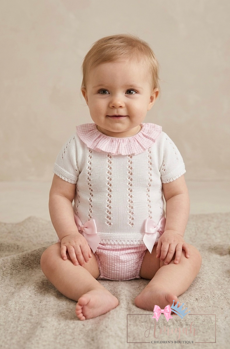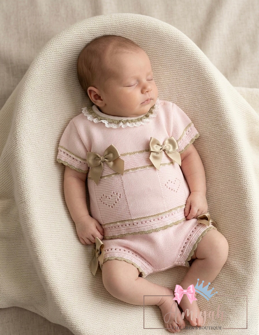 Pink & Beige Double Bow Knitted Shorts Set
