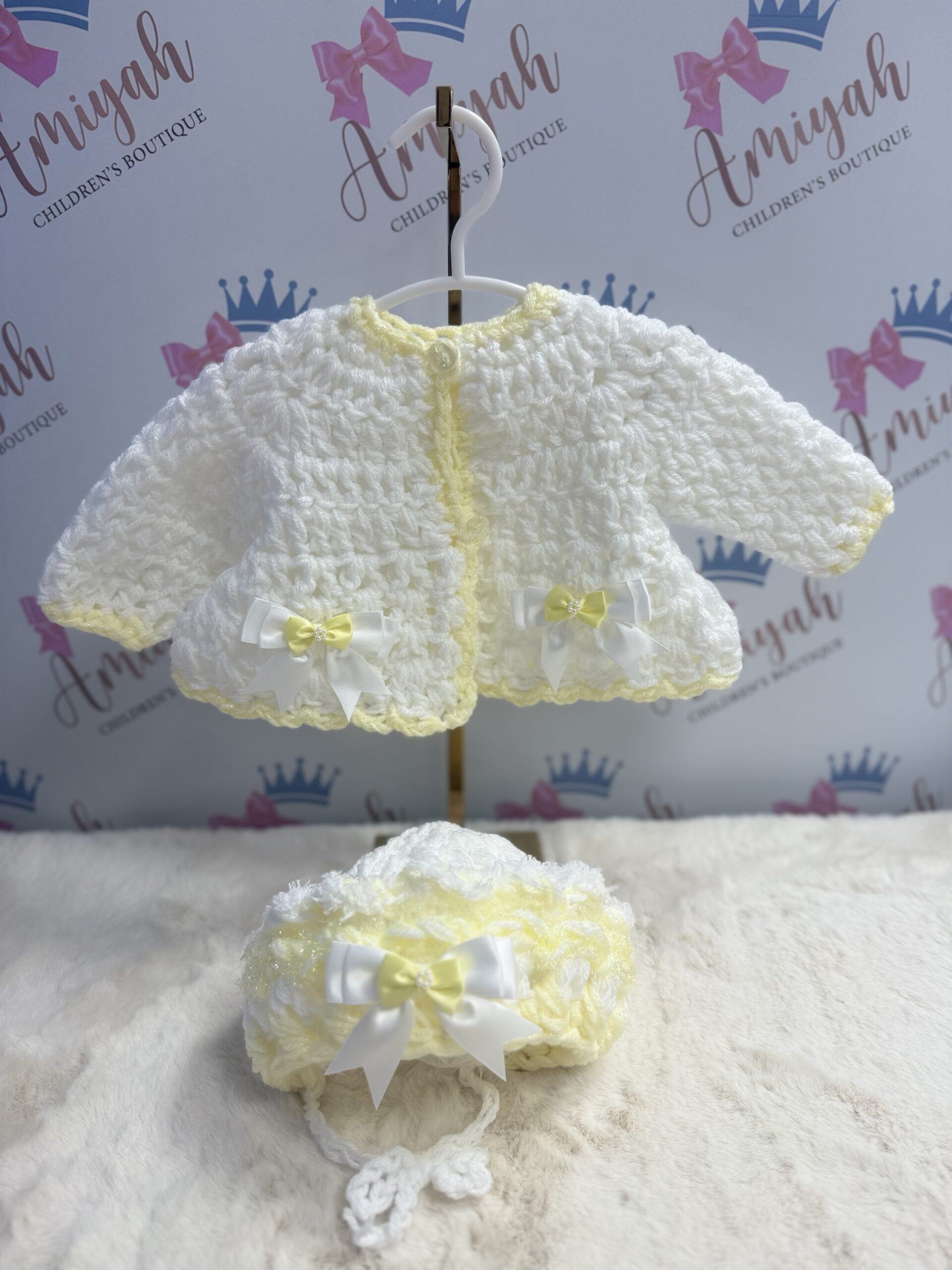 White & Lemon Hand Knitted Cardigan & Bonnet