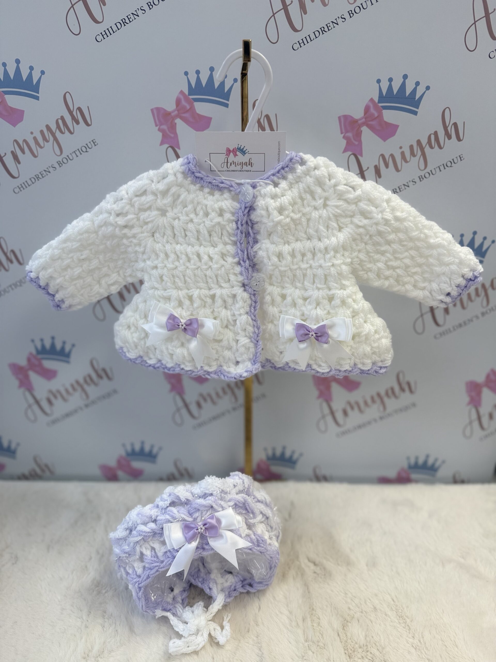 White and Lilac Hand Knitted Cardigan & Bonnet