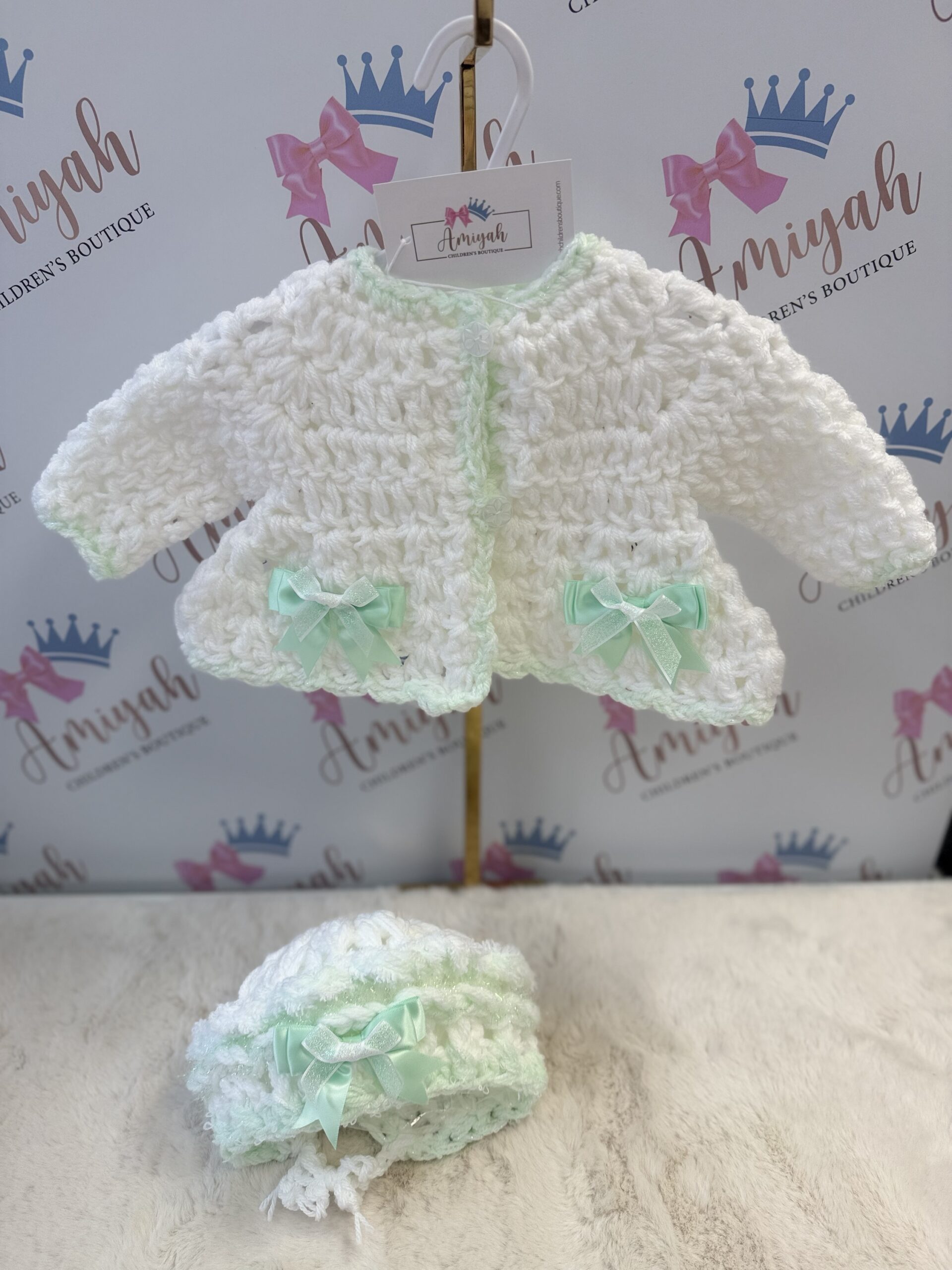 White and Mint Hand Knitted Cardigan & Bonnet