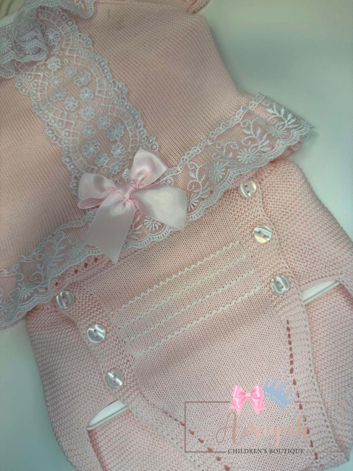 Soft, sweet, and full of vintage charm, this pink lace knit two piece is a timeless treasure for your little one’s wardrobe. Designed in a soft pink with intricate lace panel detailing and a beautifully scalloped collar, this piece blends traditional elegance with everyday comfort. The dainty bow at the waist adds the perfect finishing touch, making it ideal for special moments and cherished photographs.